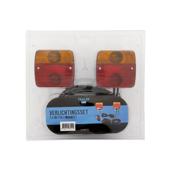 Set bestaande uit twee meerkamer achterlichten, elk bevestigd op een sterke magneet. Compleet met 7,50 meter kabel met 7-polige stekker. Incl. lampjes (2x 21W bol/2x21/5W bol).