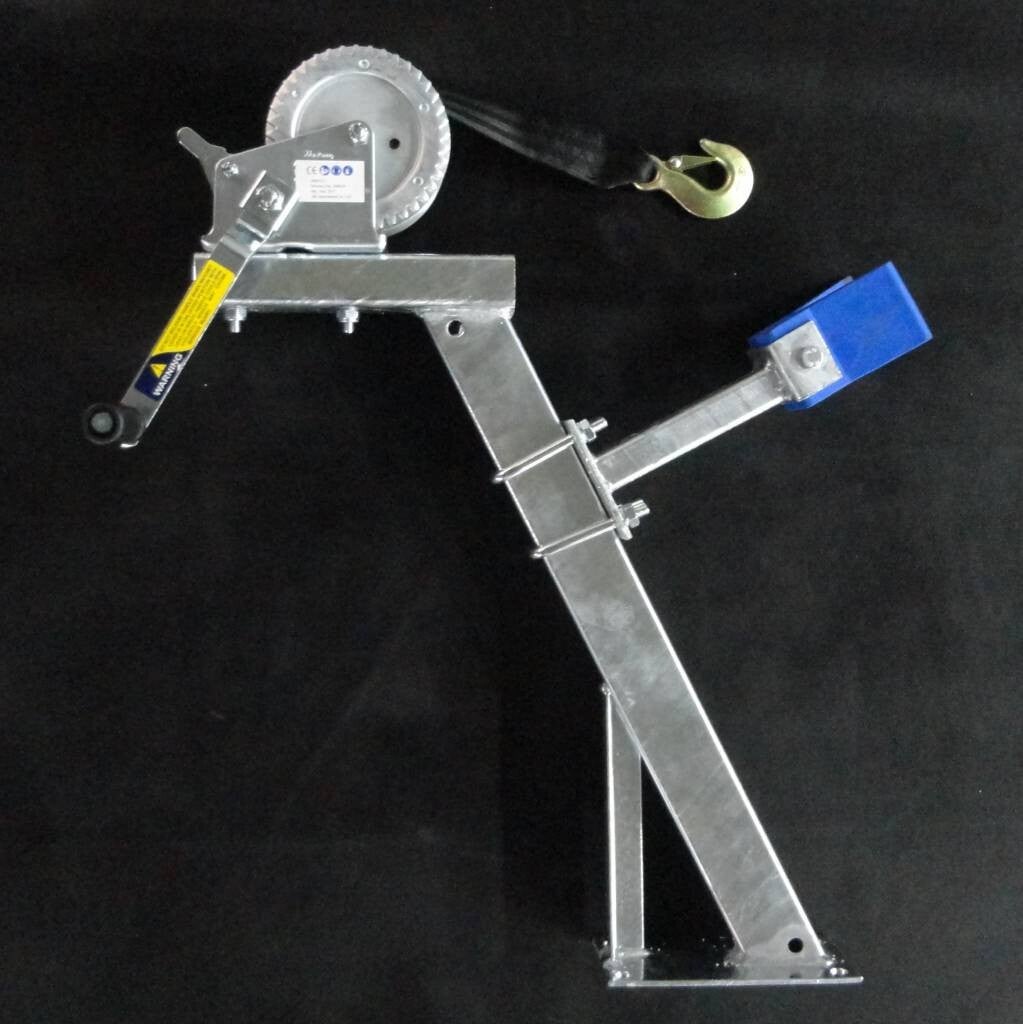 Standaard liersteun voor trailers met een draagvermogen tot 750 kg. Compleet met boegstuk en 1200 LBS lier met band.