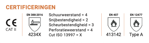 de Europese Verordening (EU) 2016/425 en de EN-normen: EN420 / EN388:2016 / EN407 en EN12477 Type A.